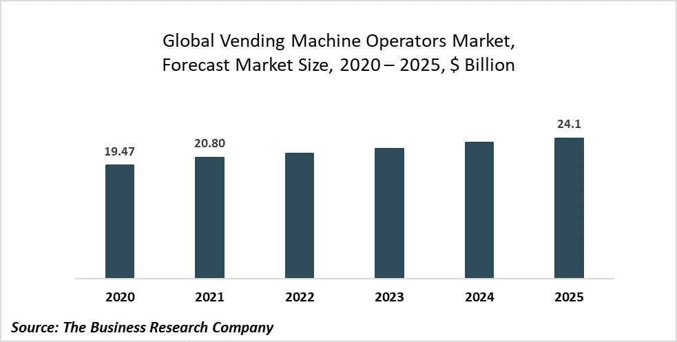 The global vending machine operators market is expected to grow from $19.47 billion in 2020 to $20.8 billion in 2021 at a compound annual growth rate (CAGR) of 6.8%. The growth is mainly due to the companies rearranging their operations and recovering from the COVID-19 impact, which had earlier led to restrictive containment measures involving social distancing, remote working, and the closure of commercial activities that resulted in operational challenges. The global vending machine market size is expected to reach $24.1 billion in 2025 at a CAGR of 3.8%.